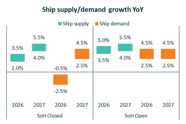 “With the exception of ships currently stuck in the Persian Gulf, ship supply growth is mostly unimpacted by the lack of transits through the Strait of Hormuz whereas demand is expected to fall by 5% in 2026. However, we find it likely that the ships no longer serving Persian Gulf ports will be made idle, laid up or used to cover contingencies rather than redeployed in other trade lanes. What appears as a substantial weakening of the global supply/demand balance might therefore not significantly impact other trade lanes,” says Rasmussen.