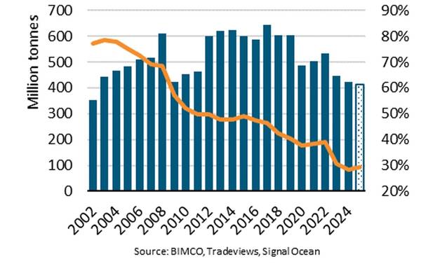 So far in 2025, 57% of these cargoes have been transported by panamax ships and another 30% by capesize ships. Price competition from the panamax segment appears to have increased, raising their share of cargoes by three percentage points compared to 2024.