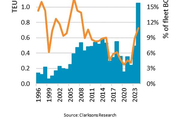 The order book contains 2 million TEU for delivery in 2024 and delivery volumes for the year is on target to exceed 3 million TEU, 30% higher than last year’s record. In 2025, deliveries should end just below 2 million TEU, the third highest deliveries in one year only exceeded in 2023 and 2024.