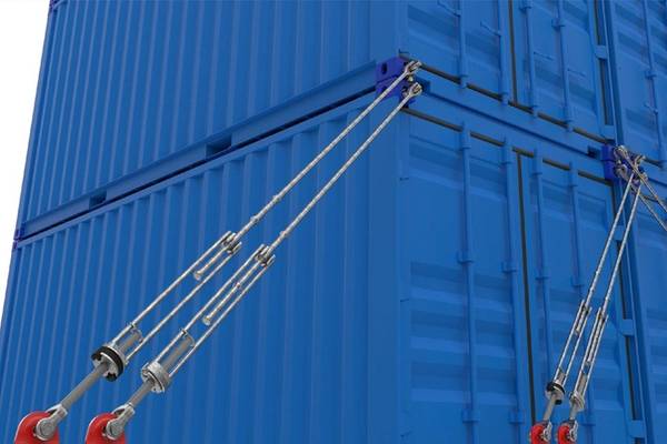 •Enhanced Safety: The system reduces the risk of broken container corners and lashing bar failures by eliminating peak loads on the upper turnbuckles.