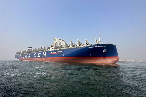 CMA CGM's Monte Cristo is the first vessel in a series of six 15,000-TEU methanol container ships, as part of the group’s decarbonization strategy. Image courtesy CMA CGM