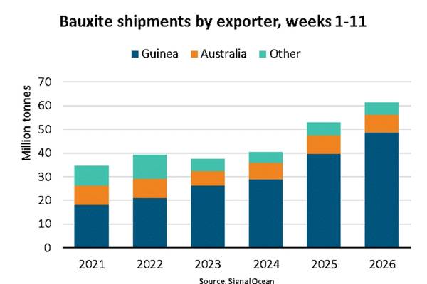 "During the first 11 weeks of 2026, bauxite shipments have surged 16% y/y, driven by strong Chinese demand for Guinean cargoes. Guinean bauxite has remained highly competitive, accounting for 79% of shipments and pushing non-Guinean bauxite shipments down 3% y/y. Bauxite has been one of the fastest growing dry bulk commodities, growing 10% on average between 2021 and 2025,” says Filipe Gouveia, Shipping Analysis Manager at BIMCO.