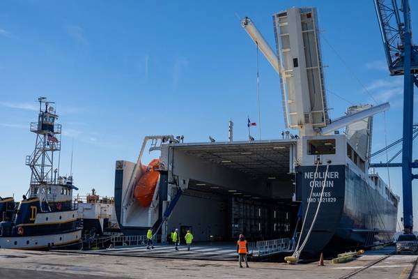 Neoliner Origin first visited Baltimore on October 30. The ship is designed to carry a diverse array of cargos, including oversized project equipment, farm and construction machinery, and containers. The vessel measures approximately 446 feet in length and provides capacity for more than 5,300 tons of cars, agricultural equipment, and construction machinery, or up to 265 TEU on three decks.